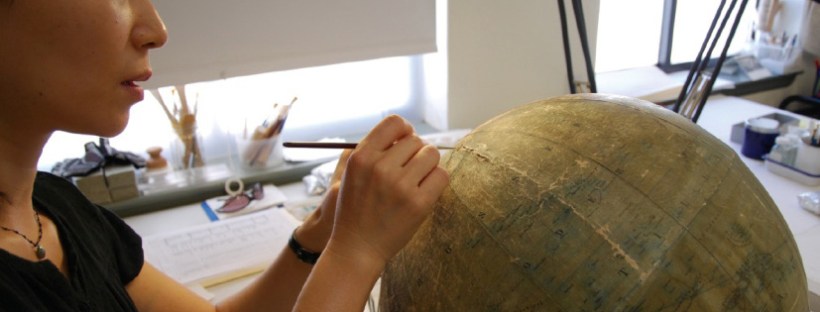 Conserving Einstein’s Globe: Paper Conservator Minah Song consolidating the fragile surface of the globe using wheat starch paste applied with a brush