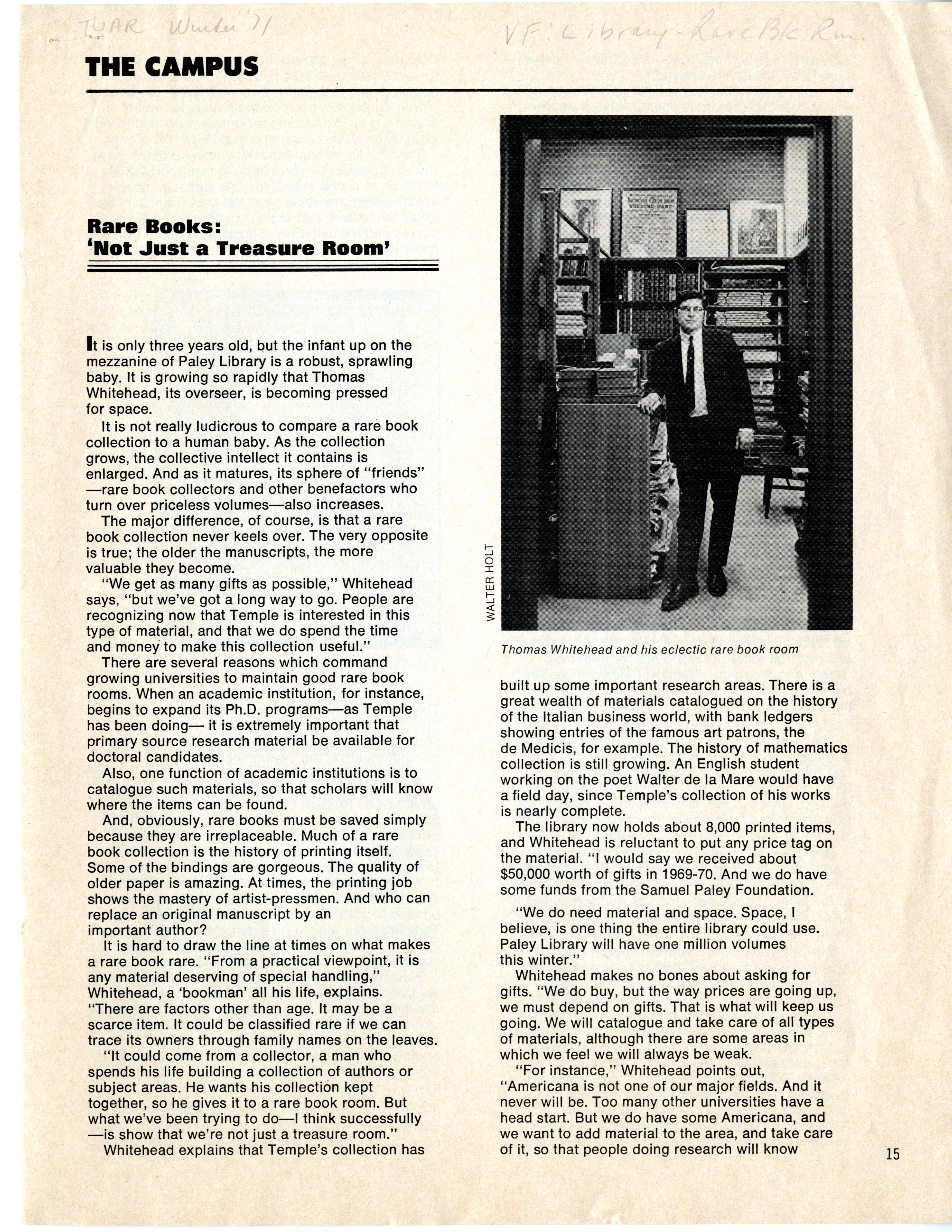 Knowledge Building explains—and through unique materials shows—how and why certain collections and collecting interests developed during Paley’s years as Temple University’s central library. It also introduces our library patrons to the rich resources found in the Special Collections Research Center (SCRC) today.