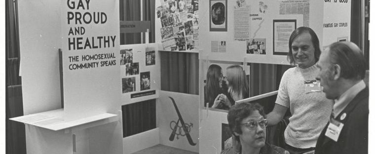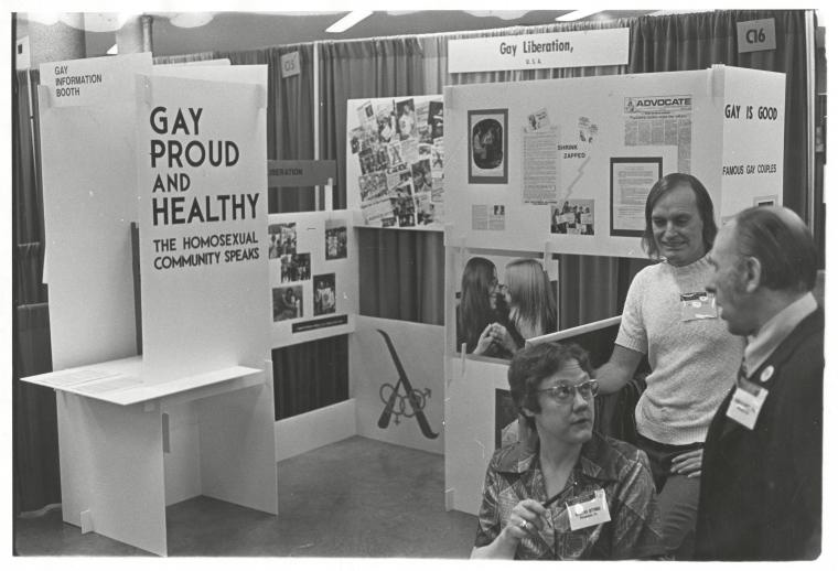Between 1972 and 1978, Gittings, Kameny, and Gittings’ partner Kay Lahusen created three informational display booths for national meetings of the APA. Portions of these confrontational booths, donated to the John J. Wilcox, Jr. Archives of the William Way LGBT Community Center by Kay Lahusen, have been restored and are presented together for the first time as part of an exhibit called “Gay Love on Display: Taking on the APA”