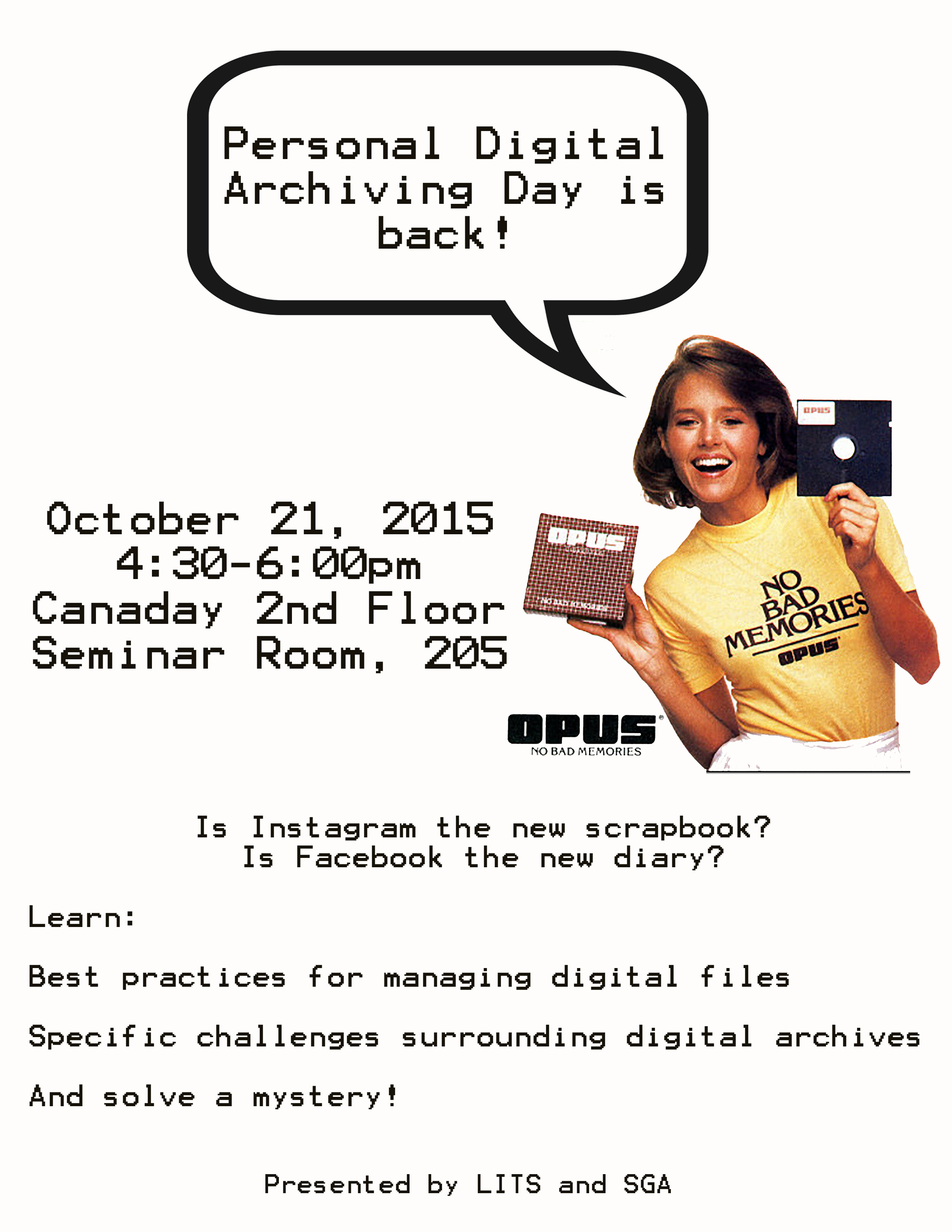 LITS and SGA’s Personal Digital Archiving Day workshop will focus on best practices for managing personal digital archives as well as issues and challenges surrounding digital archiving, culminating in a hands-on mystery game.
